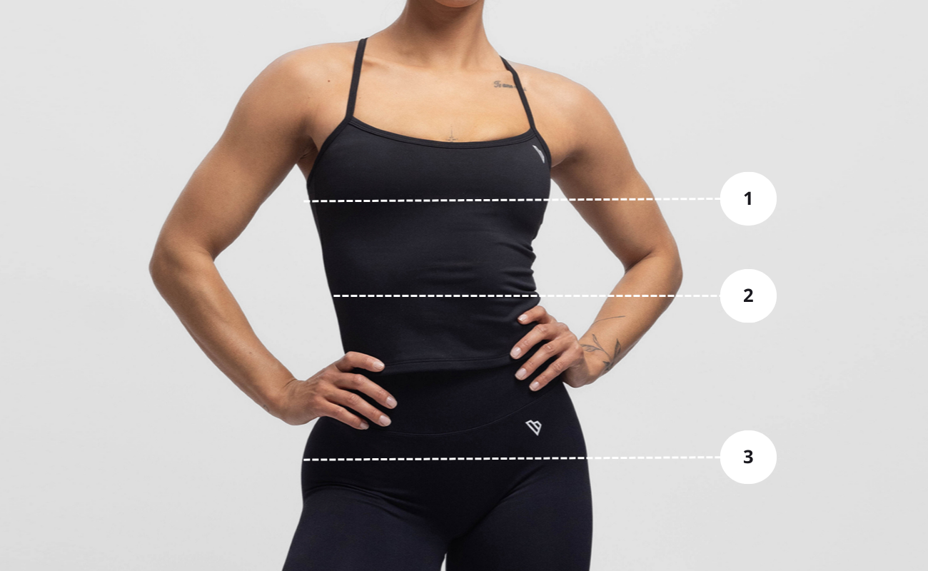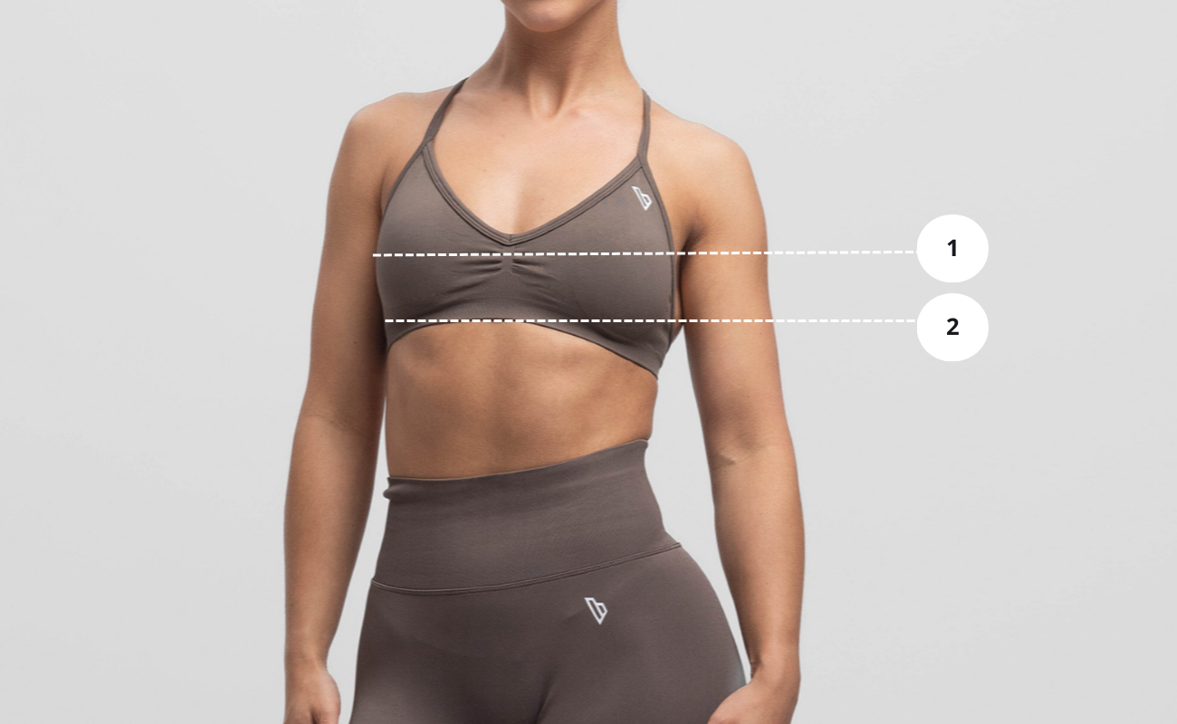 2) ONDER DE BORST - Meet de volledige omtrek onder uw borst om uw bandmaat te bepalen. Het meetlint mag uw borstweefsel niet raken, dus u moet uw borsten mogelijk optillen om een nauwkeurige meting te krijgen.