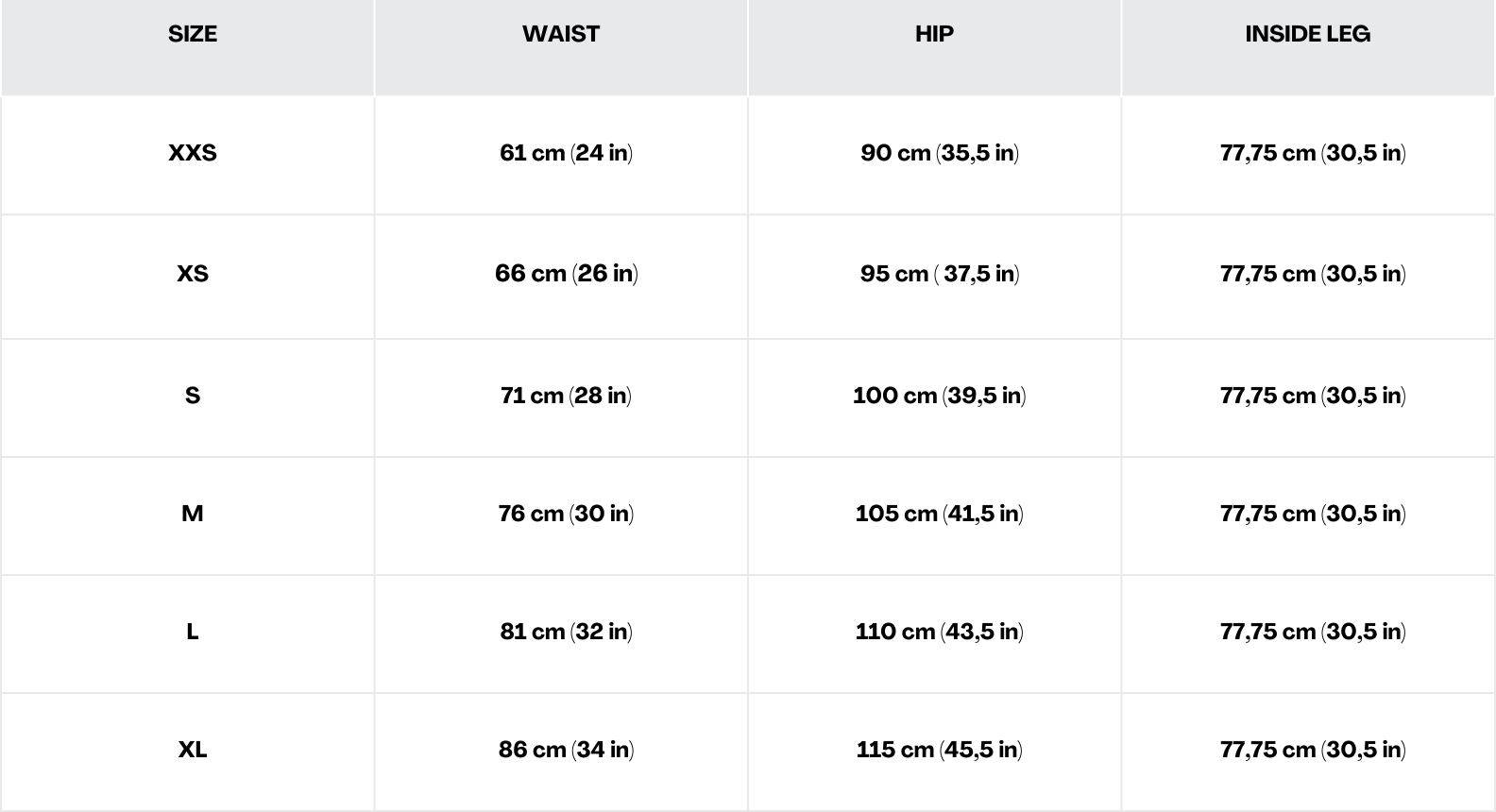 Om de juiste maat te vinden, meet u uw taille, heupen en binnenbeenlengte met behulp van de onderstaande maattabel. Vergelijk deze vervolgens met onze maattabel om de juiste maat te vinden;