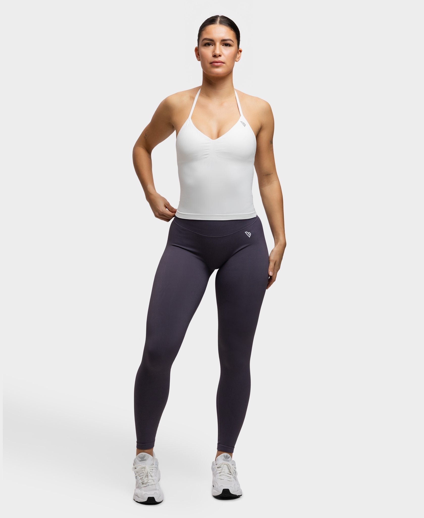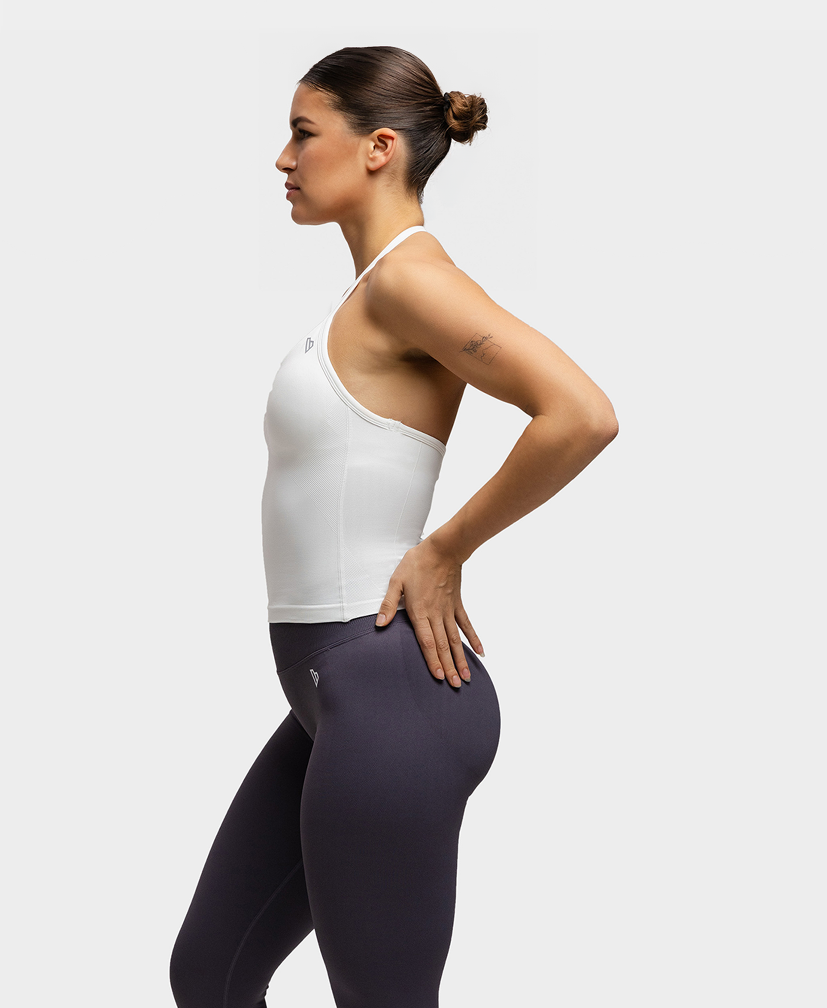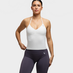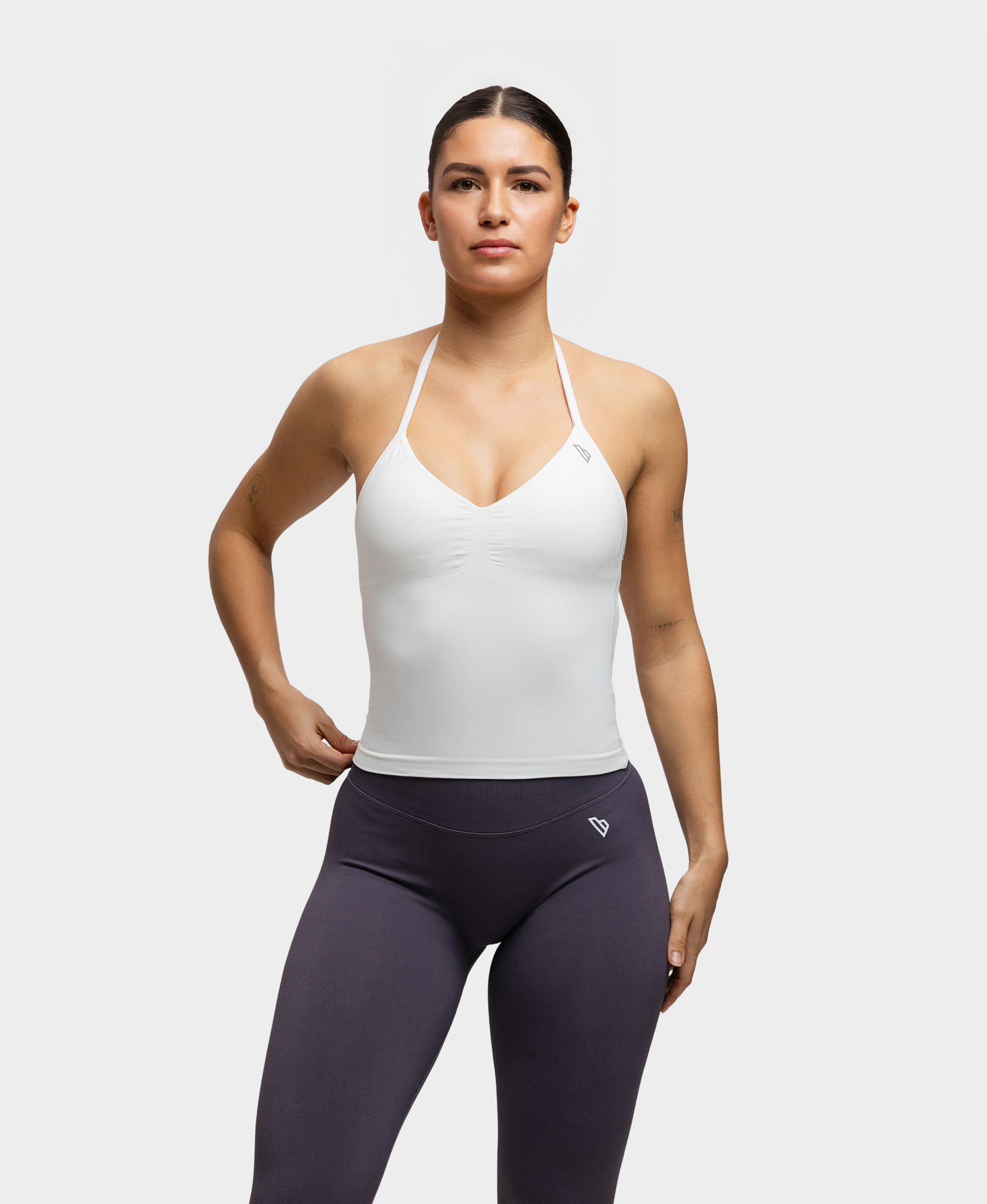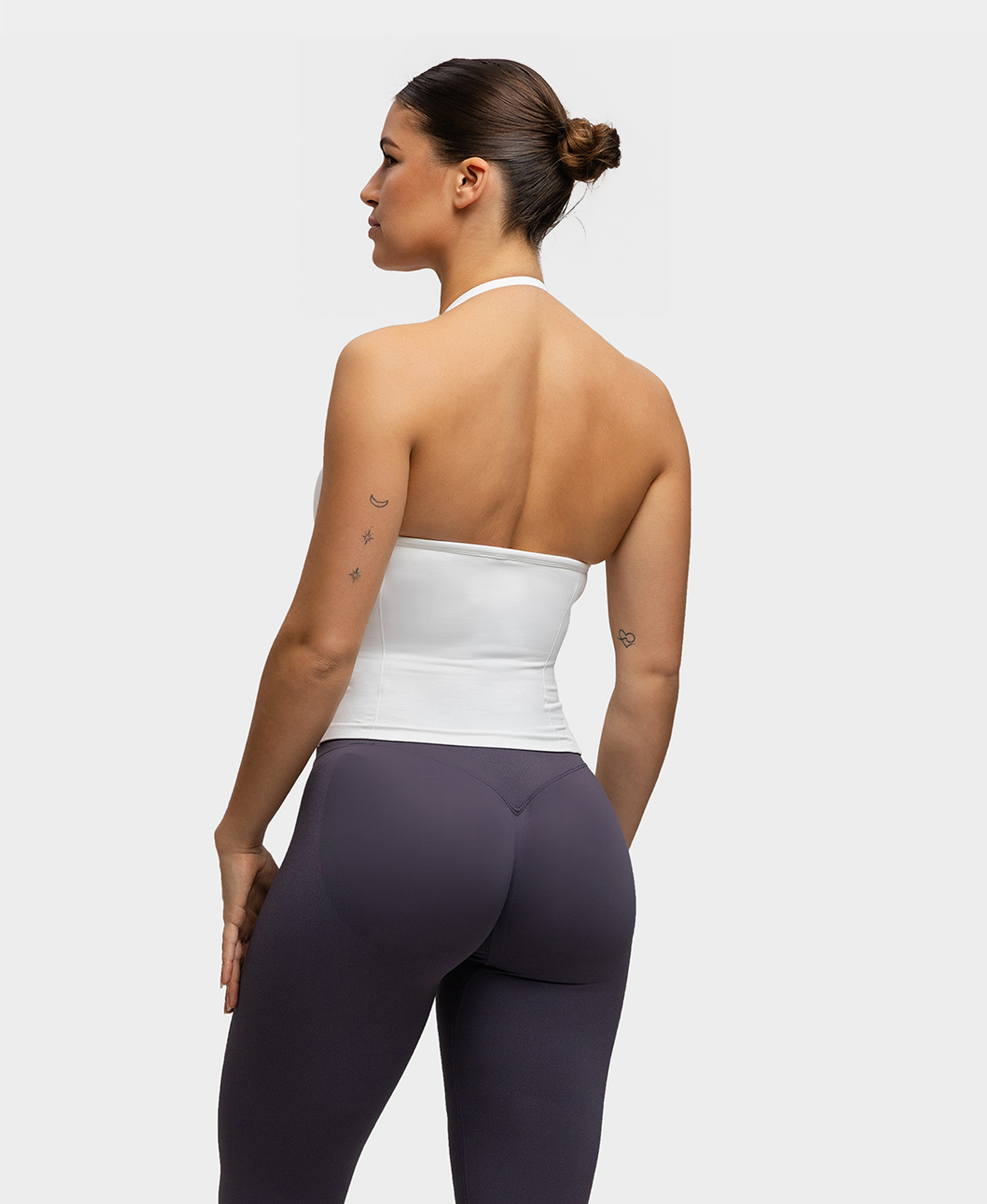 Designed with a flattering strappy halterneck and open back to highlight your gains, Blending performance with style, this halter top hugs in all the right places and includes a built-in bra with removable pads for a fit that works with you.