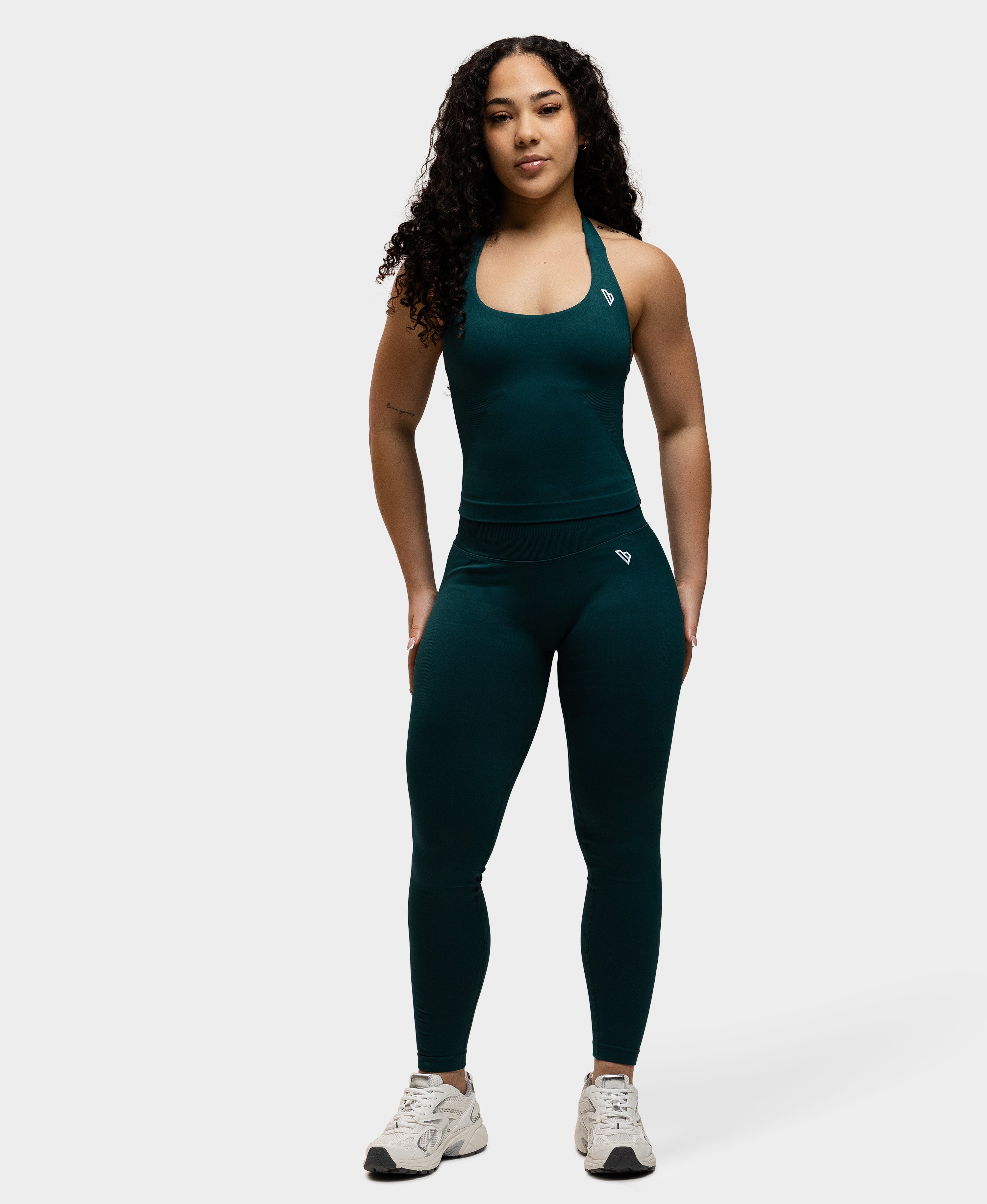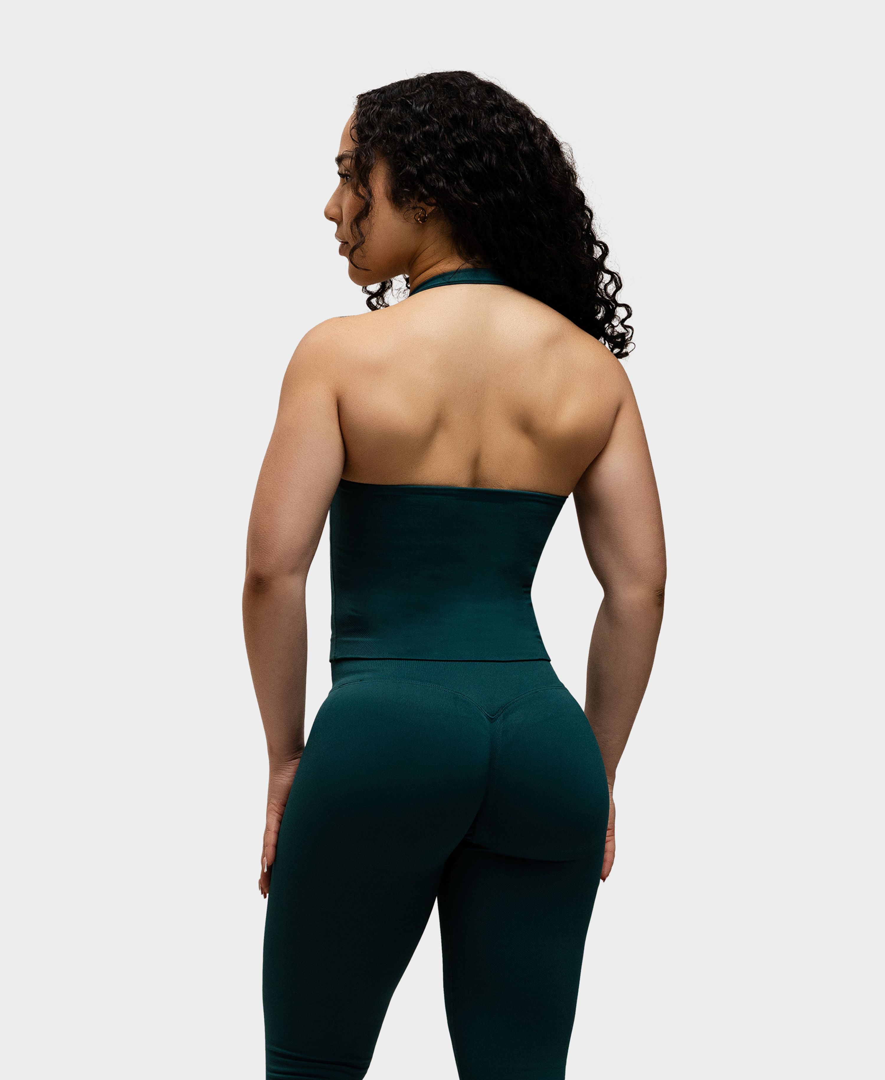 Designed with a flattering scoop neckline and sleek halter silhouette, this top enhances your shape while offering confident support. The open-back design highlights your physique, while the seamless, body-hugging fit blends performance with a clean, elevated aesthetic.